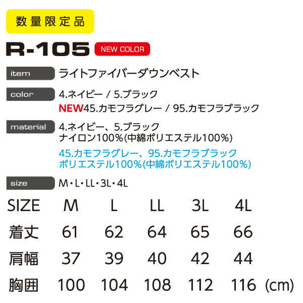 イーブンリバー(EVEN RIVER) ライトファイバーダウンベスト 【WINTER CLOTHES】 R-105 中面入りライトダウンベスト 軽くて暖かいインナー&アウターで幅広くつかえるアイテム 防寒服 防寒ウエア 2020秋冬新商品